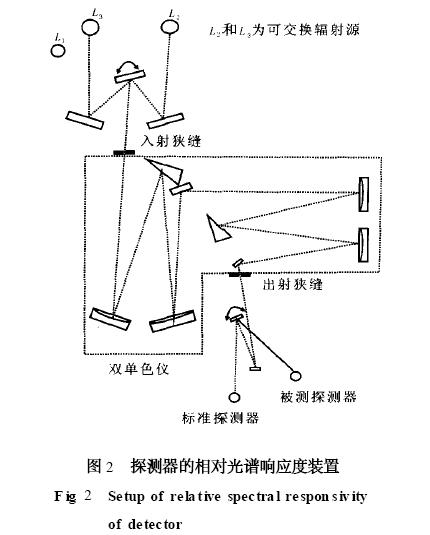 相對光譜響應度測量用的傳遞標準是非選擇性的腔形熱電堆, 為了保持它的非選擇性, 熱電堆必須在窗口外操作。但由于沒有窗口, 探測器隨外界空氣波動很靈敏, 它將產生一個毫瓦級的等效噪聲功率。為了準確測量, 必須提供幾十毫瓦的輻射功率, 該輻射功率對雙單色儀來說是不能接受的。如果使用單個單色儀, 則將會產生大量的雜散輻射, 但不會影響測量準確度, 因為被校準的熱電堆與腔探測器一樣無選擇性。