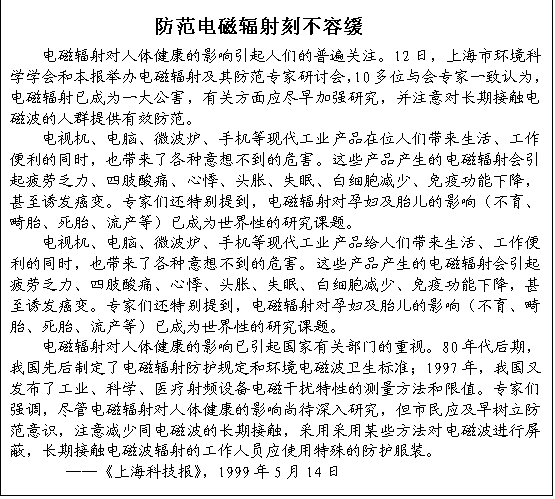 我們希望政府及有關職能部門采取切實措施,組織一些有關電磁知識的宣傳活動,讓人們在利用電磁波的同時清醒的意識到電磁波的危害,增強自我防護意識。如果需要,我們中學生愿意成為電磁輻射的義務宣傳員。具體措施如下: